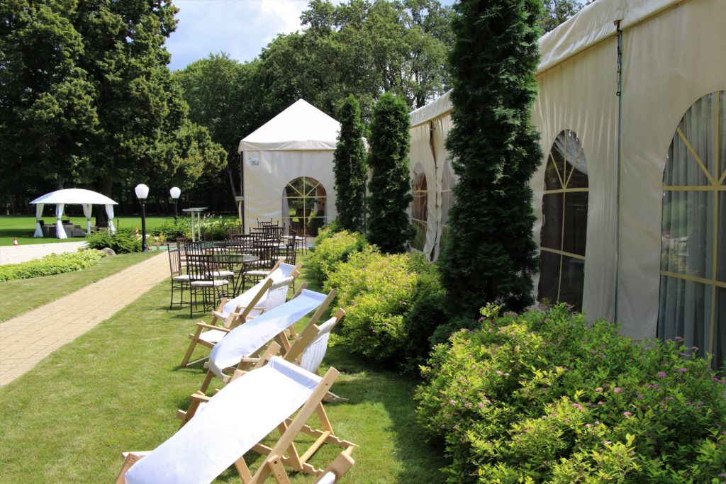 W wersji podstawowej czasami spotykamy się na weselach po prostu ze stolikami i krzesłami ogrodowymi jako dodatkową strefą siedzącą na zewnątrz. Dla mnie jednak szczerze mówiąc relaks zaczyna się wtedy, kiedy można spokojnie odpocząć, a więc usiąść wygodnie albo nawet się położyć.